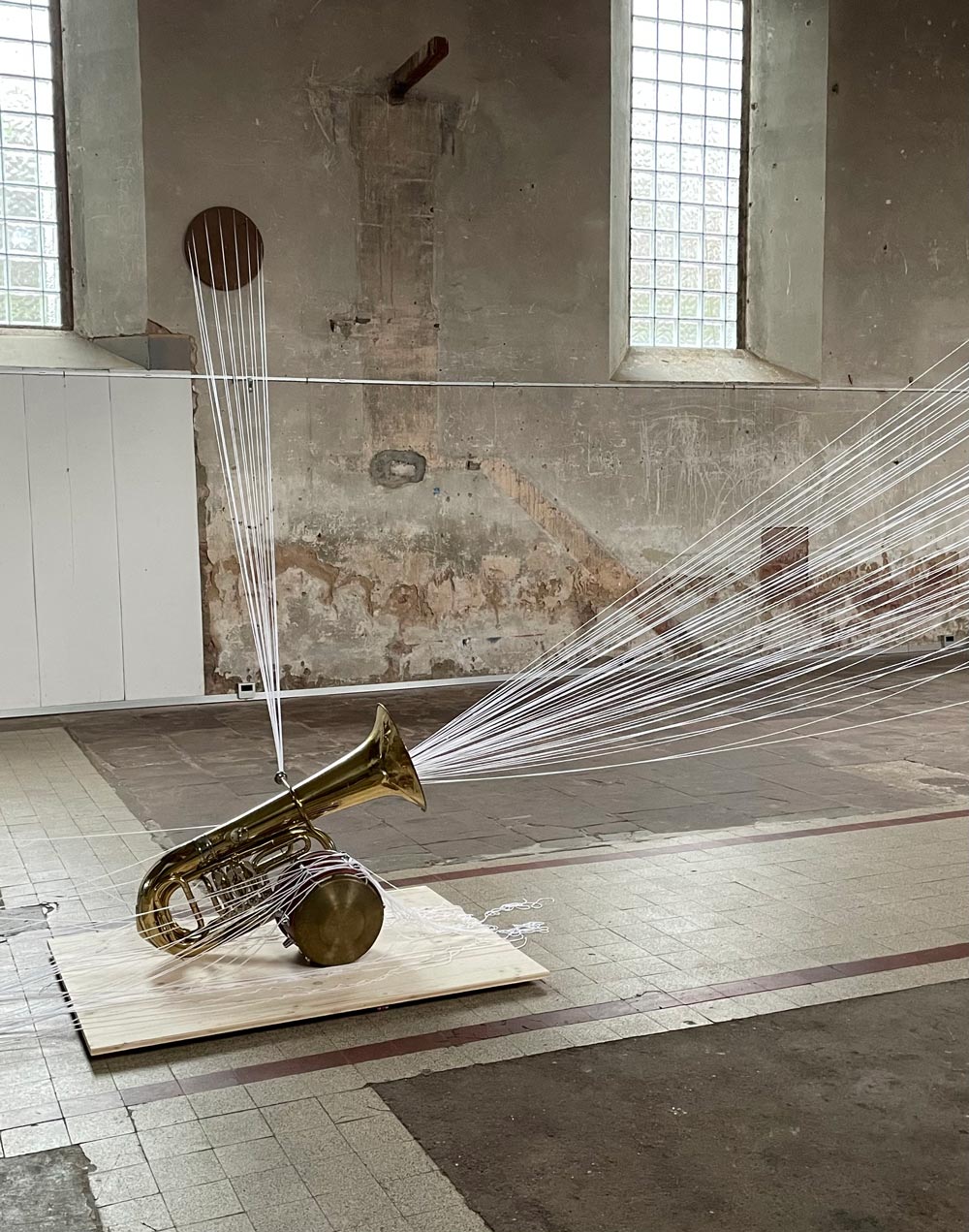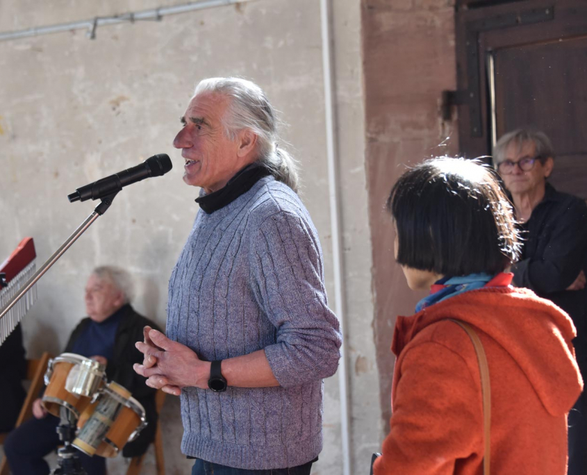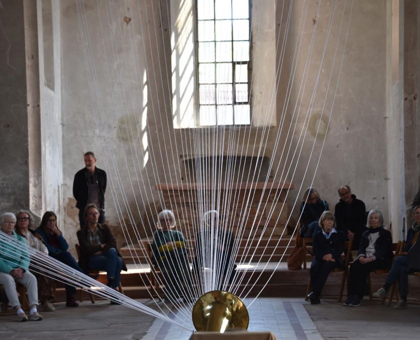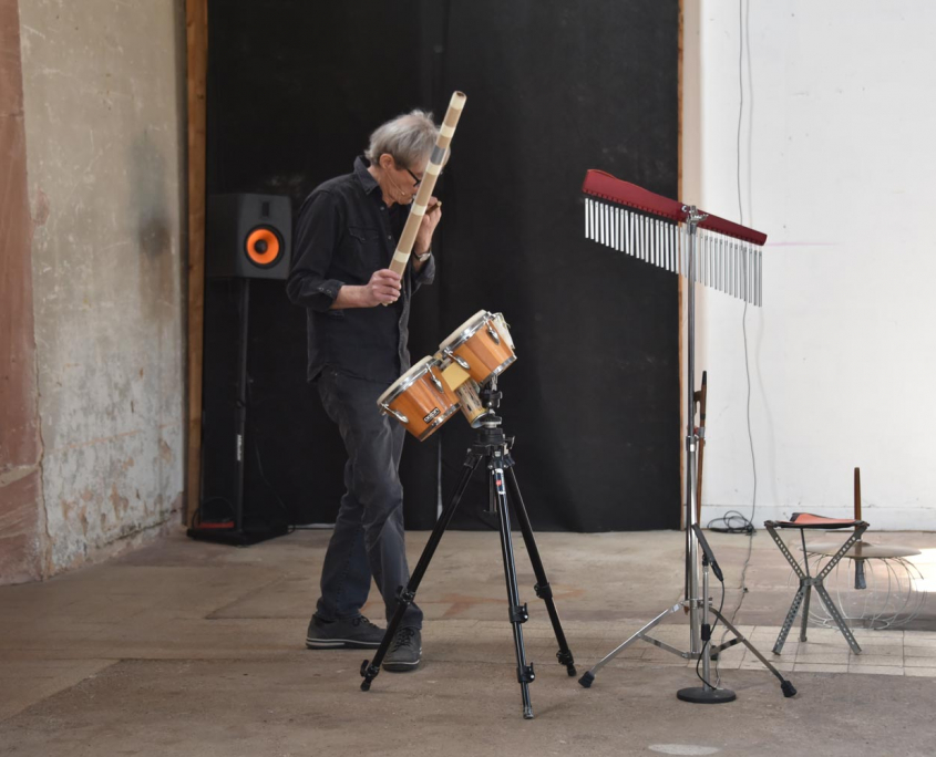 Diese Klangcollage wird durch minimalistisch angelegte, perkussive Elemente als Performance vor Ort von ihm erweitert und zusammengeführt.